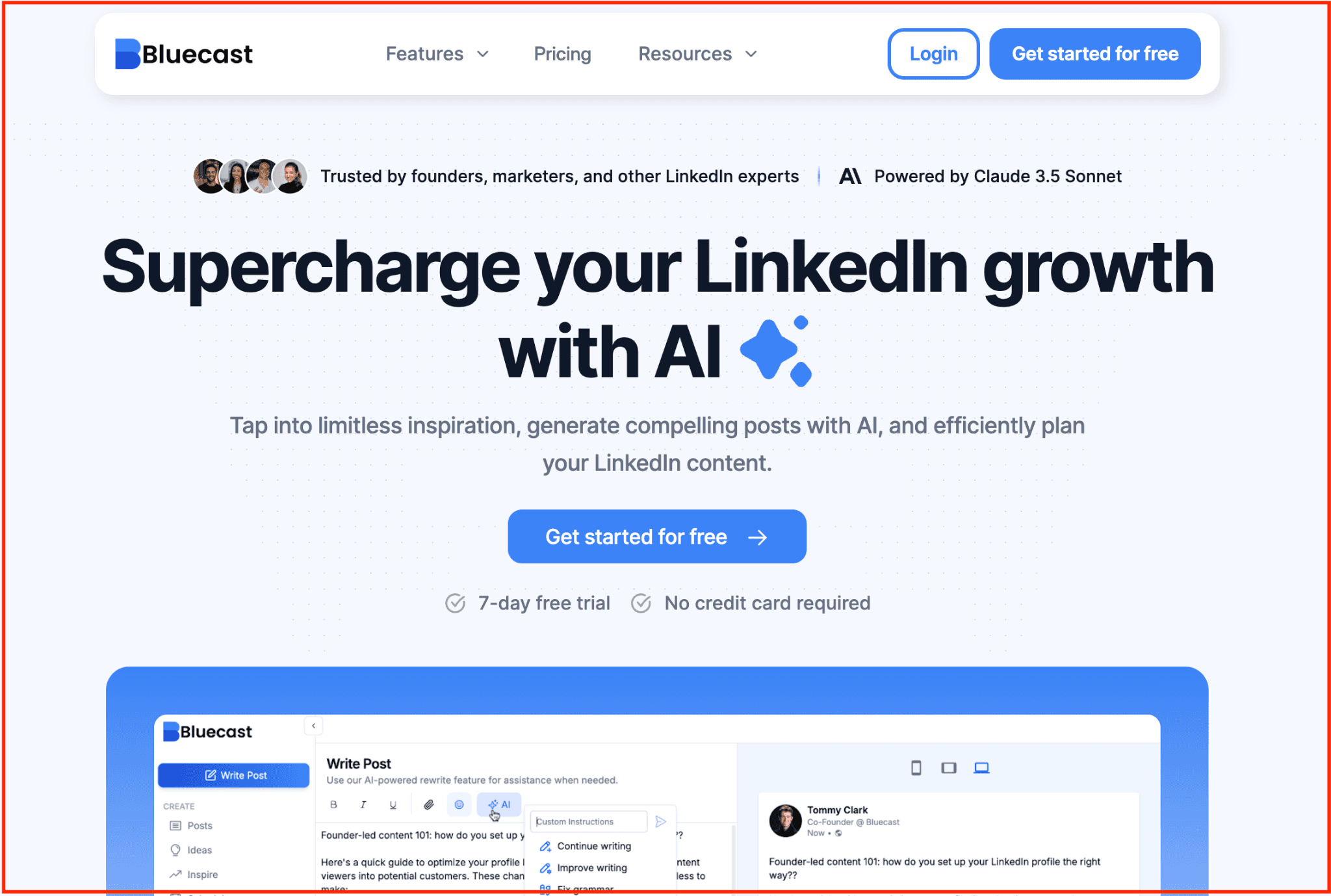 Bluecast is an all‑in-one AI-powered LinkedIn content tool aimed at creators, marketers, and B2B professionals who want to simplify their content workflow. It helps you generate post ideas, draft LinkedIn‑ready posts (or repurpose content), and schedule them — all within a unified dashboard.