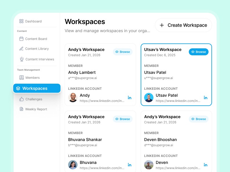 Your team's LinkedIn accounts are their most valuable professional asset. Supergrow uses official APIs and compliant methods only, so you scale thought leadership without putting anyone's account at risk.