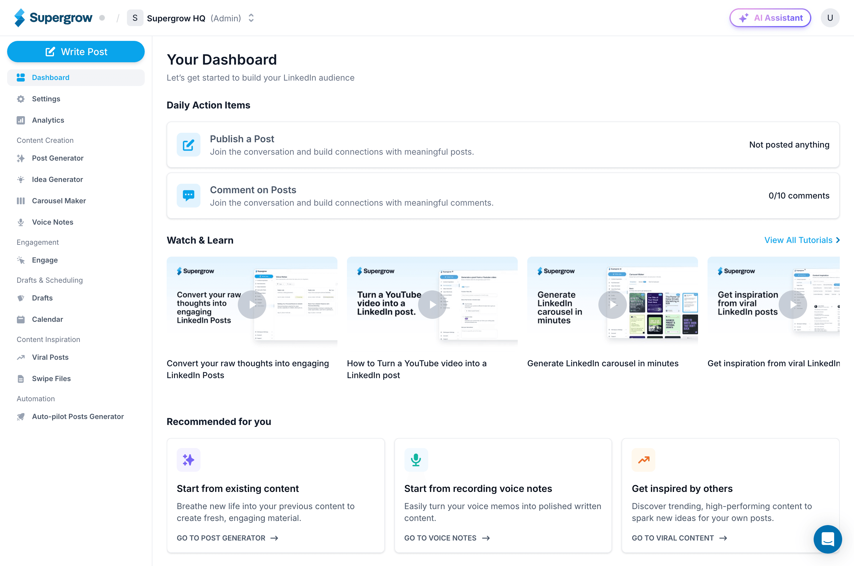 No more AI content that falls flat. Supergrow learns and applies your unique professional tone for unmatched personal branding on LinkedIn.